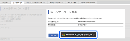 Web Configの[ネットワーク]タブ-[メールサーバー]-[基本]のページでサインインの状態が確認できます。