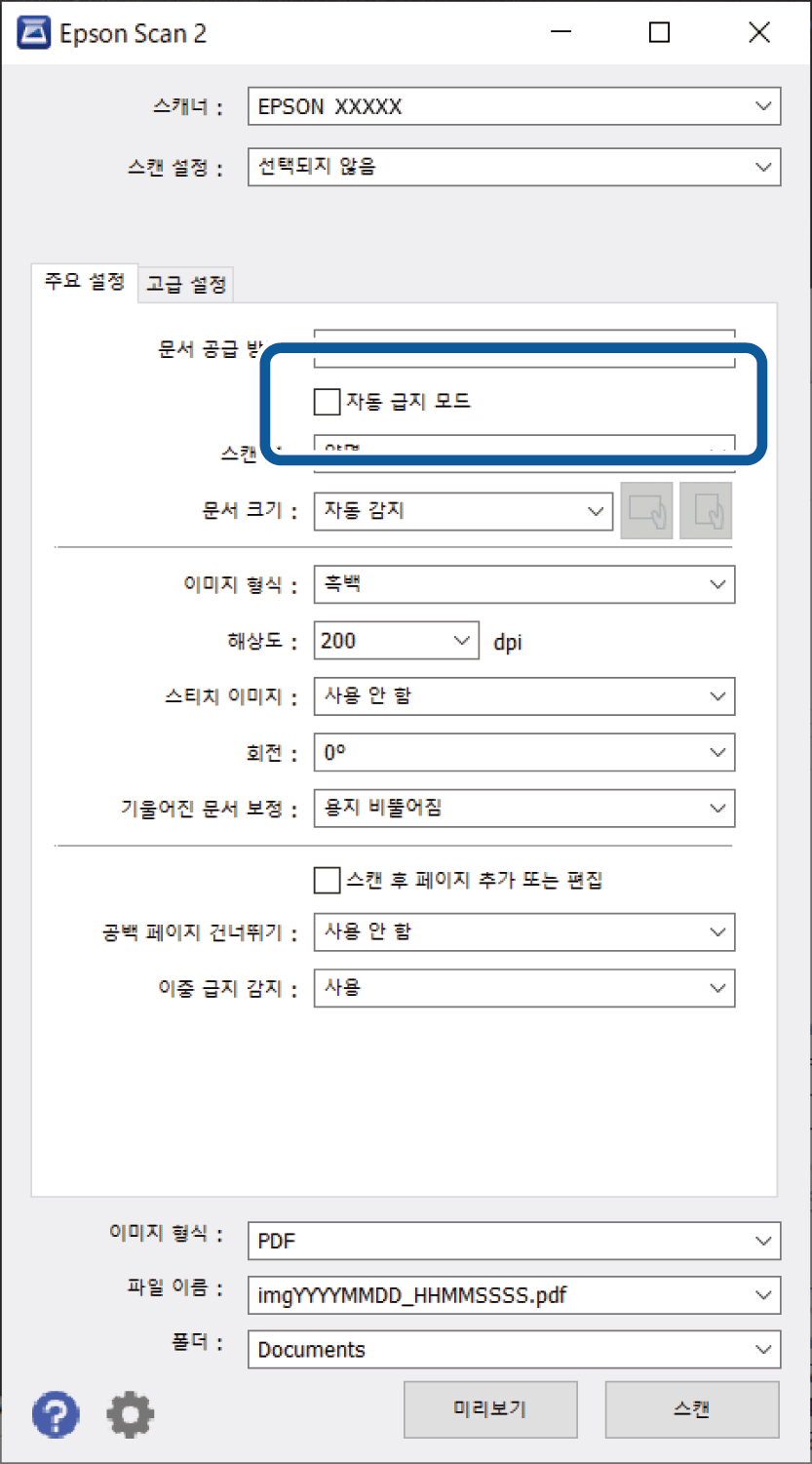 Document Capture Pro를 사용할 경우 자동 급지 모드도 사용할 수 있습니다.