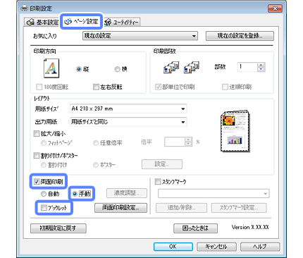 [ページ設定]タブをクリックして、[両面印刷]をチェックし[手動]をクリックします。