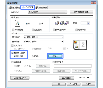 [ページ設定]タブをクリックして、[割り付け/ポスター]をチェックし、[割り付け]をクリックして[設定]をクリックします。