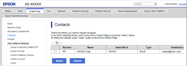 Καρτέλα Σάρωση/Αντιγραφή ή Φαξ > Επαφές
