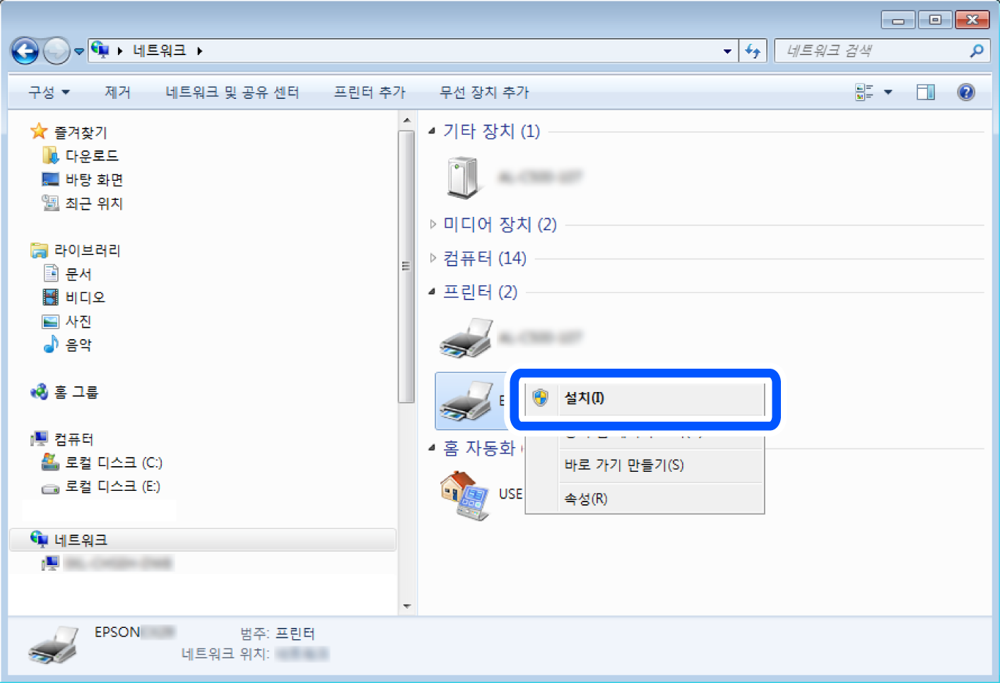 프린터를 마우스 오른쪽 버튼으로 클릭한 후 설치를 클릭합니다.