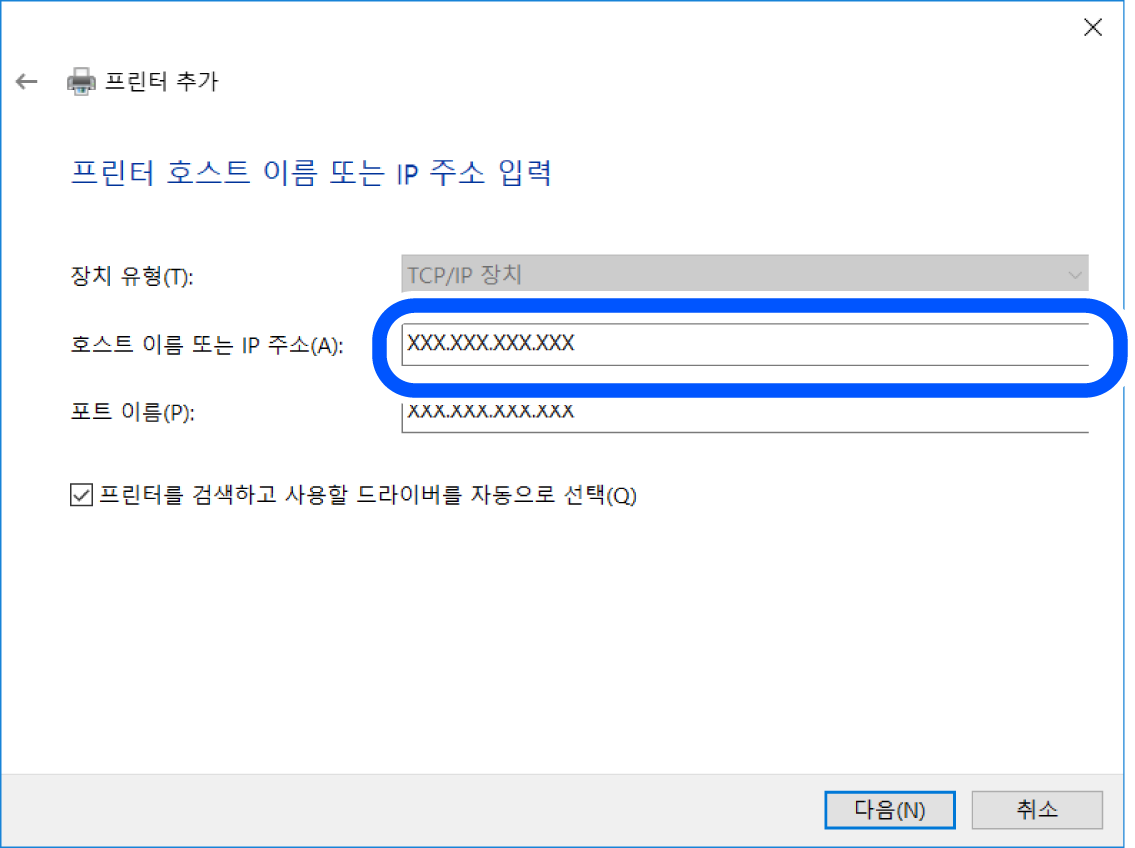호스트 이름 또는 IP 주소 또는 프린터 이름 또는 IP 주소에 프린터의 IP 주소 또는 프린터 이름을 입력한 후 다음을 클릭합니다.