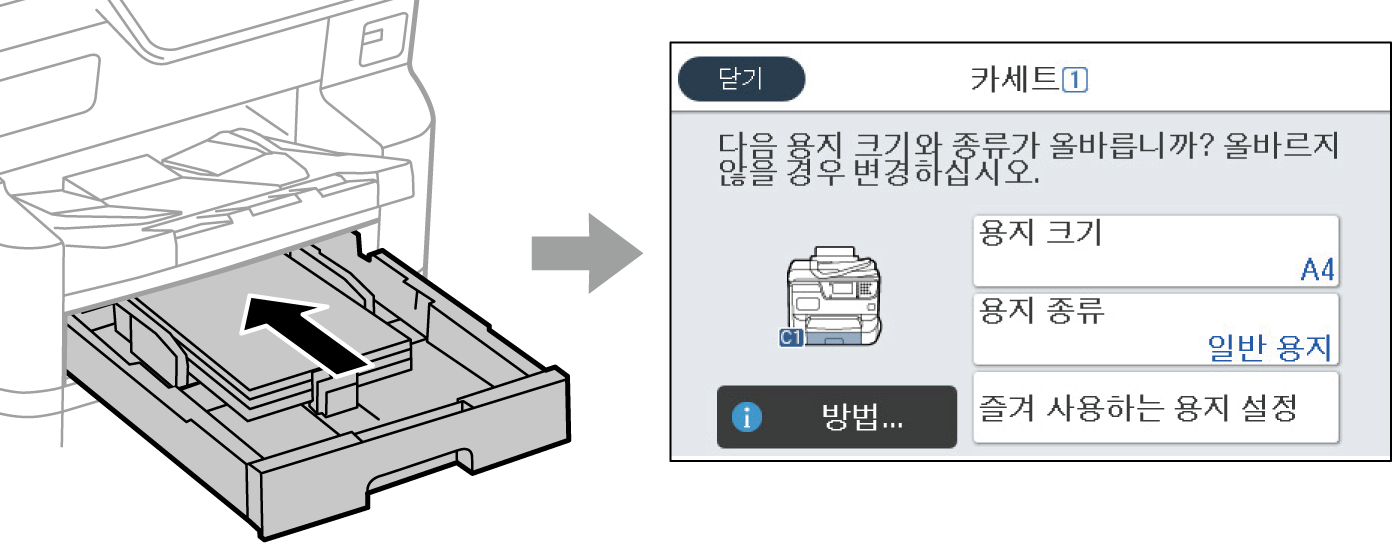 표시된 용지 크기 및 종류가 급지된 용지와 다른 경우에는 변경할 항목을 선택하십시오. 설정이 급지된 용지와 일치하면 화면을 닫으십시오.