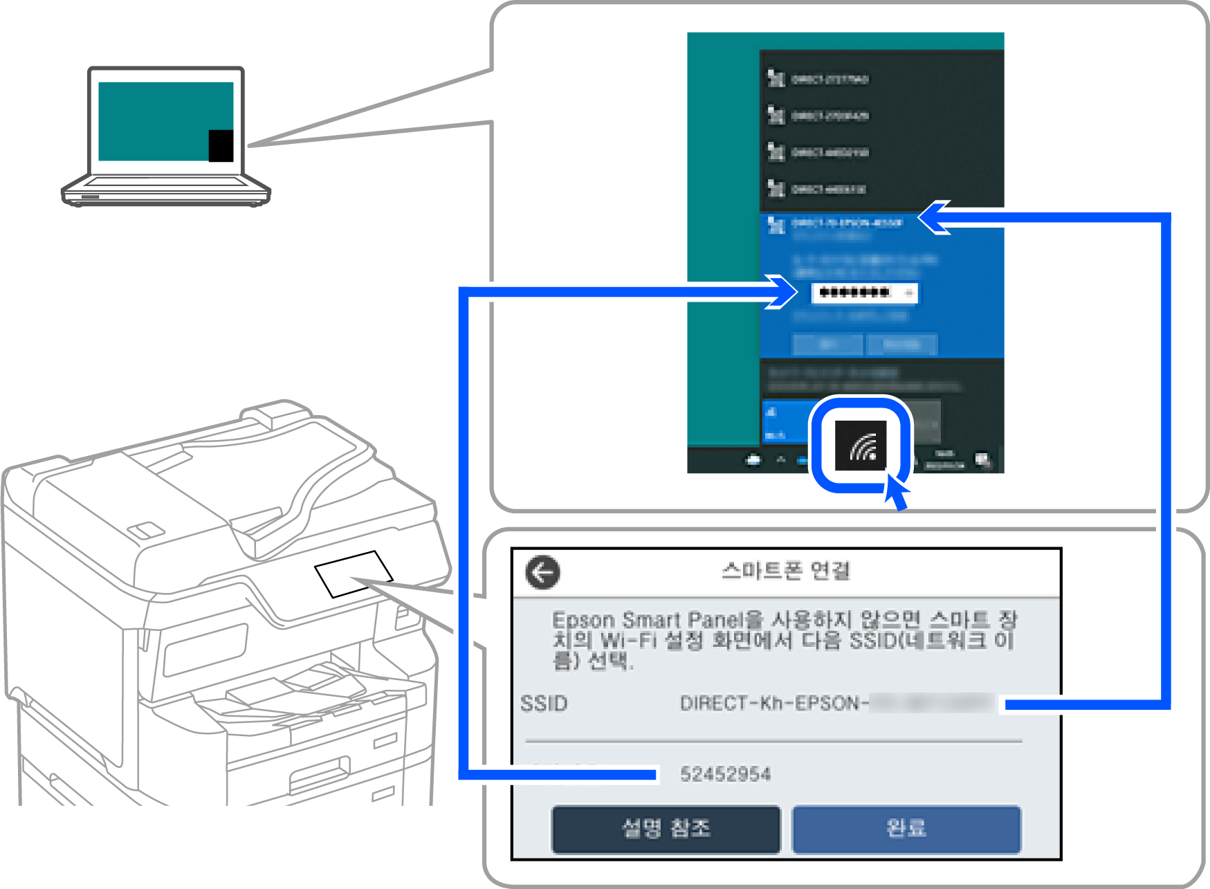 컴퓨터의 네트워크 연결 화면에서 프린터 제어판에 표시된 SSID를 선택한 다음 비밀번호를 입력합니다.