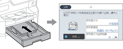 如果显示的打印纸尺寸和类型与装入的打印纸不同,请选择要更改的项目。如果设置与装入的打印纸匹配,请关闭屏幕。
