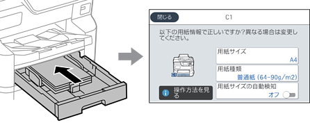 表示された用紙サイズや種類がセットした用紙と異なる場合は、項目を選択して変更してください。このままでいい場合は画面を閉じてください。