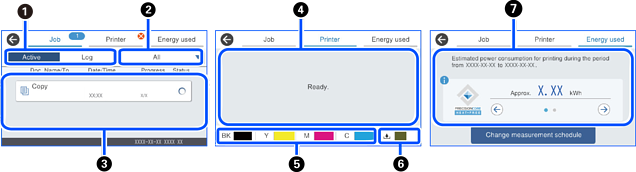 Wanneer Actief is geselecteerd, wordt een lijst weergegeven met actuele opdrachten en opdrachten in de wachtrij. Wanneer Logboek is geselecteerd, wordt de taakgeschiedenis weergegeven. U kunt taken annuleren of de foutcode controleren die in de geschiedenis wordt weergegeven wanneer een taak is mislukt. |