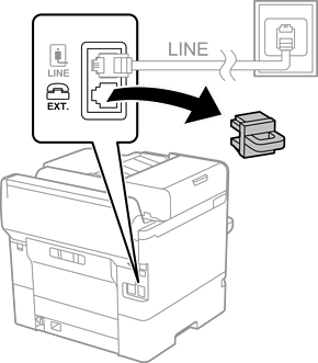 Lorsque vous partagez une unique ligne téléphonique, assurez-vous de brancher le dispositif téléphonique au port EXT. de l’imprimante. Si vous séparez la ligne pour connecter le dispositif téléphonique et l’imprimante séparément, le téléphone et l’imprimante ne fonctionnent pas correctement.
