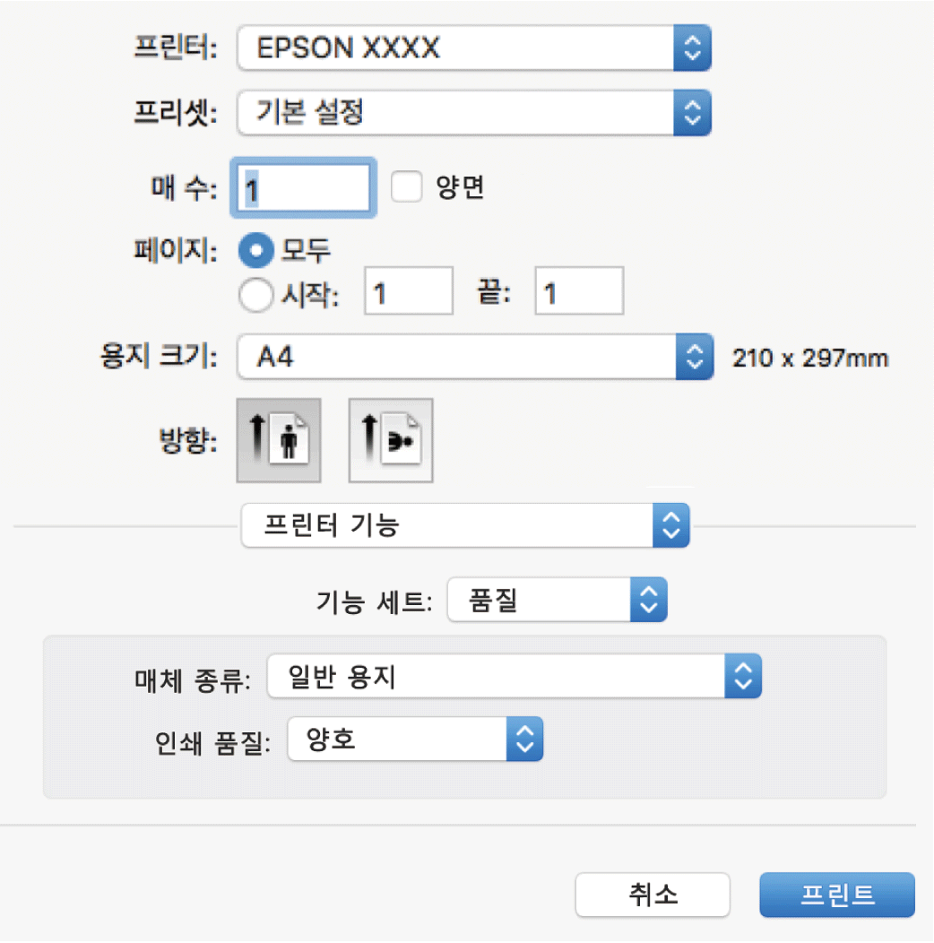 > 인쇄 > 문서 인쇄 > Mac OS의 PostScript 프린터 드라이버에서 인쇄
