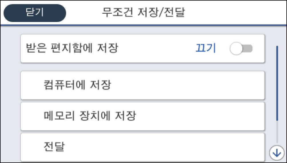 수신한 팩스에 대한 무조건 전달 설정은 여기까지 입니다. 필요에 따라 일반 설정을 지정할 수 있습니다. 자세한 내용을 보려면 저장/전달 설정 메뉴에서 일반 설정에 대한 설명을 참조하십시오.