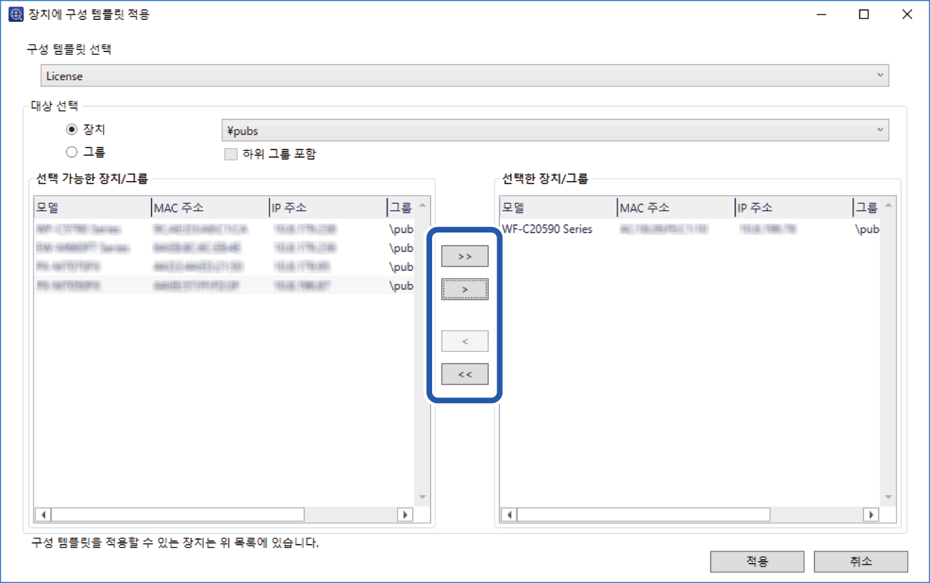 [>], [>>], [<], [<<]를 사용하여 템플릿을 적용하려는 장치 또는 그룹을 선택한 장치/그룹로 이동시킵니다.
