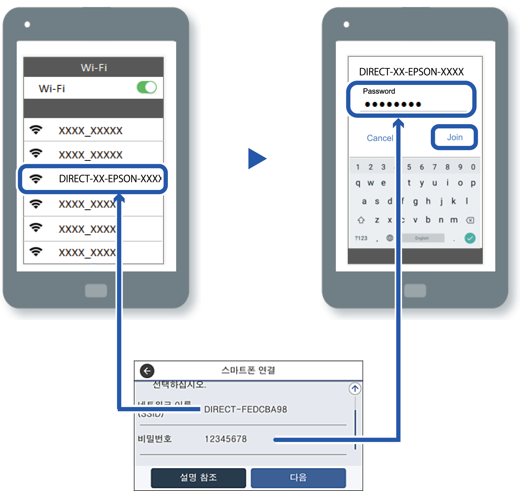 장치의 Wi-Fi 화면에서 프린터 제어판에 표시된 SSID를 선택한 다음 암호를 입력합니다.