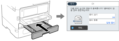 용지를 급지할 때 표시되는 화면에서 용지 크기와 종류를 등록했는지 확인하십시오. 등록된 정보와 인쇄 설정이 다를 경우 프린터에서 알려줍니다. 이렇게 하면 용지 종류와 일치하지 않는 설정을 사용하여 잘못된 용지 크기로 인쇄하거나, 잘못된 색상으로 인쇄하지 않도록 하여 용지와 잉크를 낭비하는 것을 방지할 수 있습니다.