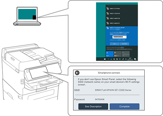 Pada skrin sambung rangkaian komputer, pilih SSID yang ditunjukkan pada panel kawalan pencetak dan kemudian, masukkan kata laluan.