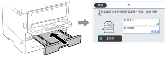 務必在放入紙張後顯示的畫面上登錄紙張大小和種類。當登錄的資訊與列印設定不同時,印表機會通知您。這可確保您不會由於使用不符合紙張類型的設定列印於錯誤紙張大小上或列印錯誤色彩,從而防止紙張和墨水浪費。