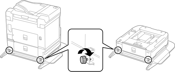 Fastgør printeren eller papirkassetteenheden på bagsiden ved hjælp af monteringsdelene og skruerne.