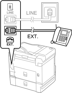 Når der deles en enkelt telefonlinje, skal du sørge for at slutte telefonen til EXT.-porten på printeren. Hvis du deler linjen for at tilslutte telefonen og printeren separat, fungerer telefonen og printeren ikke korrekt.