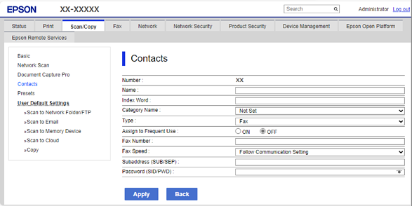 Vælg for at indstille den registrerede adresse som en hyppigt anvendt adresse. Når den indstilles som en hyppigt anvendt adresse, vises den øverst på skærmbilledet for fax og scanning, og du kan angive destinationen uden at vise kontakterne. |