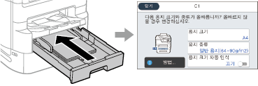 용지 카세트를 삽입할 때 표시되는 화면에 용지 크기와 종류를 등록하면 등록된 정보와 인쇄 설정이 다를 때 프린터에서 알려줍니다. 따라서, 용지 종류와 일치하지 않는 설정으로 잘못된 용지 크기에 인쇄하거나 잘못된 색상으로 인쇄하는 경우가 없기 때문에 용지와 잉크 낭비를 방지할 수 있습니다.