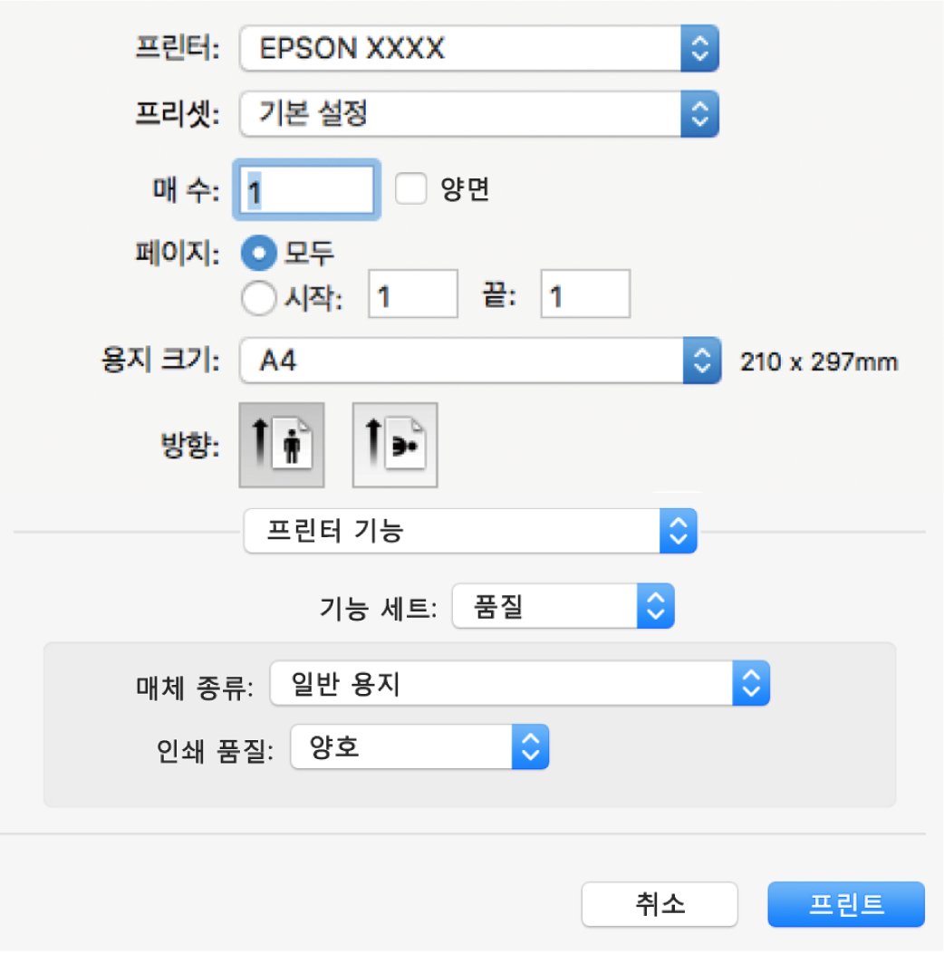 Mac OS의 PostScript 프린터 드라이버에서 인쇄