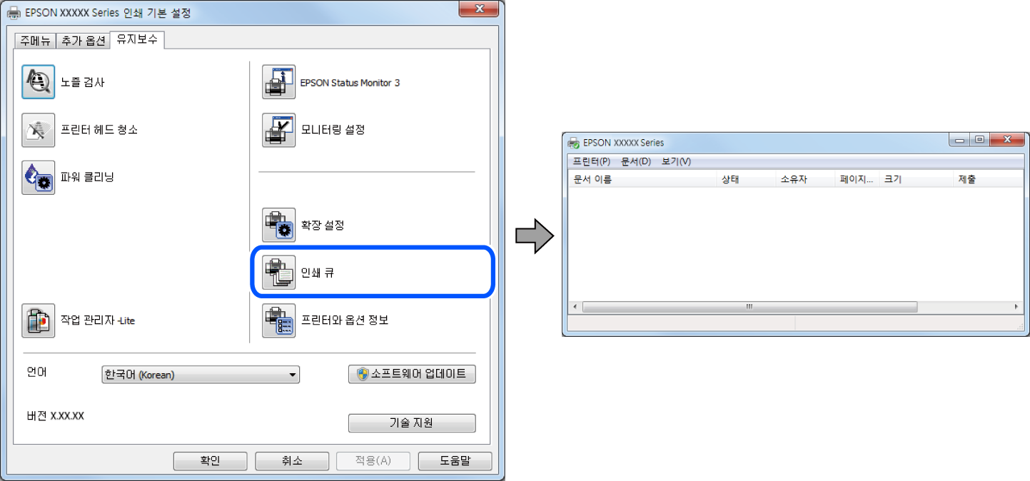 프린터 드라이버의 유지보수 탭에서 인쇄 큐를 클릭합니다.