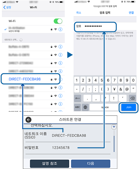 장치의 Wi-Fi 화면에서 프린터 제어판에 표시된 SSID를 선택한 다음 암호를 입력합니다.