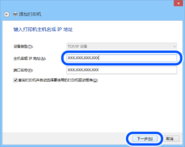 在[主機名稱或 IP 位址]或[印表機名稱或 IP 位址]輸入印表機的 IP 位址或印表機名稱,然後按下[下一步]。