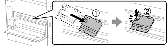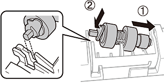 將新取紙輥的轉軸插到固定夾的孔中,然後將拉桿一側的轉軸沿槽滑動,滑動時請使其面向前面的平整桌面。