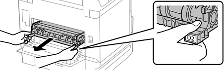 朝拉桿方向滑動取紙輥,然後將轉軸從固定夾中拉出,來取出取紙輥。
