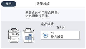 當顯示提示您更換廢棄墨水收集盒的訊息時,請參閱控制面板上顯示的動畫。根據印表機的規格,需要更換廢棄墨水收集盒不代表印表機停止運作。Epson 保固未涵蓋此項更換的成本。此為使用者可自行維修的零件。