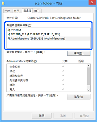 您可以在[安全性]索引標簽 > [群組或使用者名稱]中檢查哪些群組或使用者可以存取網路資料夾。