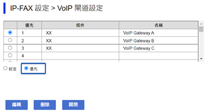 可讓您指定已登錄 VoIP 閘道之優先順序設定的畫面即會顯示。