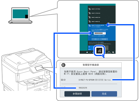 在電腦的網路連線畫面上,選取印表機控制面板上顯示的 SSID,然後輸入密碼。