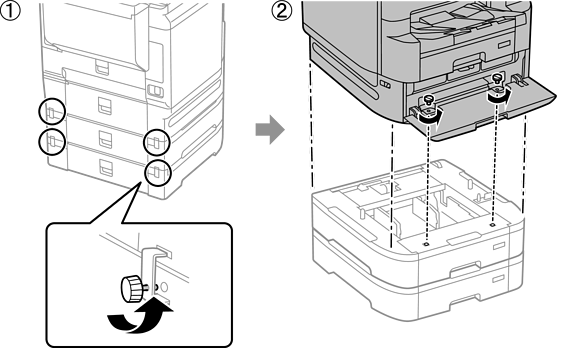 Conclua as etapas para mover a impressora e, em seguida, remova as cassetes de papel 2, 3 e 4. Em seguida, execute as etapas mostradas nas imagens a seguir.