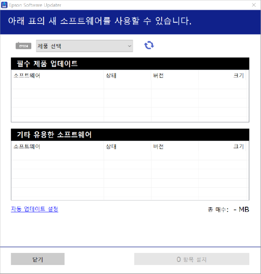 Windows Server 운영 체제를 사용할 경우 Epson Software Updater를 사용할 수 없습니다. Epson 웹 사이트에서 최신 응용 프로그램을 다운로드 할 수 있습니다.