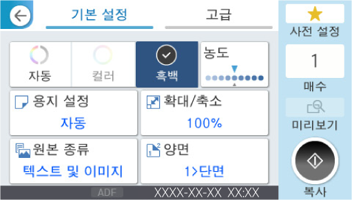 기본 설정 탭을 선택한 후 자동 또는 컬러, 흑백을 선택합니다.
