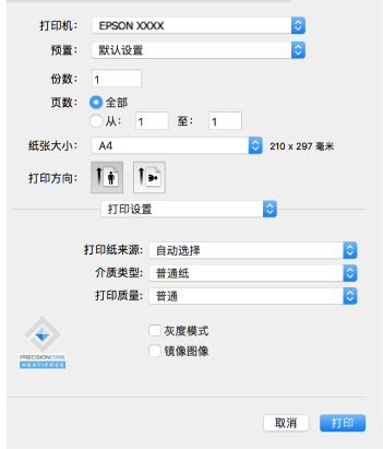 如果在 macOS Catalina (10.15) 或更高版本、macOS High Sierra (10.13)、macOS Sierra (10.12)、OS X El Capitan (10.11)、OS X Yosemite (10.10)、OS X Mavericks (10.9) 上没有显示打印设置菜单,表示爱普生打印机驱动程序没有正确安装。从以下菜单启用爱普生打印机驱动程序。