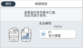 當顯示提示您更換廢棄墨水收集盒的訊息時,請參閱控制面板上顯示的動畫。根據印表機的規格,需要更換廢棄墨水收集盒不代表印表機停止運作。Epson 保固未涵蓋此項更換的成本。此為使用者可自行維修的零件。