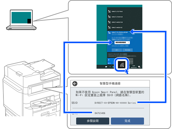 在電腦的網路連線畫面上,選取印表機控制面板上顯示的 SSID,然後輸入密碼。