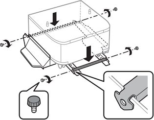 أنزل الطابعة أو وحدة درج الورق الاختيارية برفق على الخزانة بمحاذاة الزوايا، ثم ثبِّتها بالبراغي.