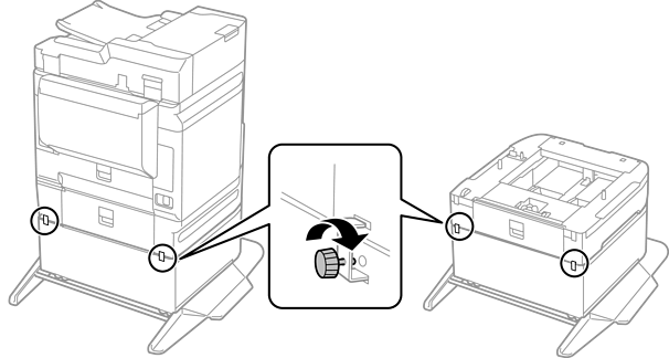 أحكم تثبيت الطابعة أو وحدة درج الورق الاختيارية من الخلف باستخدام وحدات التثبيت والبراغي المرفقة.