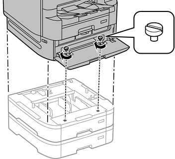 ثبِّت وحدة درج الورق والطابعة من الخلف باستخدام وحدات التثبيت والبراغي المرفقة.