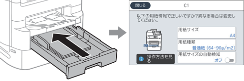 用紙サイズと用紙種類の設定画面は、操作パネルの