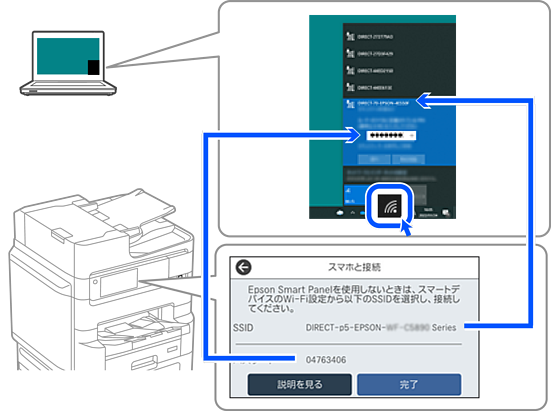 コンピューターのネットワーク接続画面を表示し、プリンターの操作パネルに表示されたSSIDを選択して、パスワードを入力します。