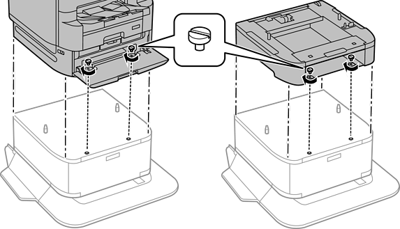 Uzmanīgi novietojiet printeri vai papildu papīra kaseti uz korpusa, līdzinot stūrus, un pēc tam nostipriniet tos ar skrūvēm.