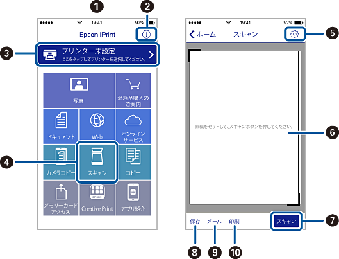 スマートデバイスでEpson iPrintを起動して、ホーム画面で使いたい項目を選択します。