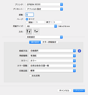 ポップアップメニューの[印刷設定]を選択して、[基本設定]タブを選択します。