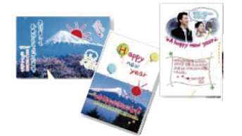メモリーカード内の写真と手書きの文字やイラストを合成して印刷できます。写真のレイアウトは「フチなし」「上半分」「下半分」から選べて、「楕円」などのフレームに入れることもできます。手書きした文字は、「モコモコ文字」にしたり多彩なフチ取りで飾ったりして、楽しい年賀状や挨拶状が作れます。詳しい説明は「メモリーカードの写真に手書き文字を合成して印刷する」のページをご覧ください。