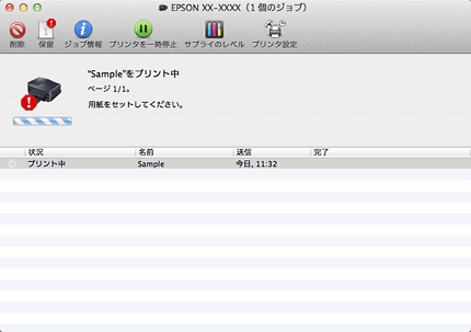 用紙をセットする前に、アプリケーションソフトで印刷(手順2〜6)を実行してください。印刷を実行し、[Dock]内の[プリンタ]アイコンをクリックすると、以下の画面が表示されますので、プリンターの画面表示に従って用紙をセットしてください。